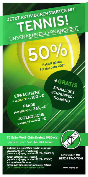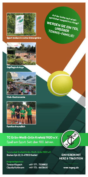 Durch den Einsatz von Cookies kann die Tennis-Club Grün-Weiß-Grün 1920 e.V. Krefeld den Nutzern dieser Internetseite nutzerfreundlichere Services bereitstellen, die ohne die Cookie-Setzung nicht möglich wären.